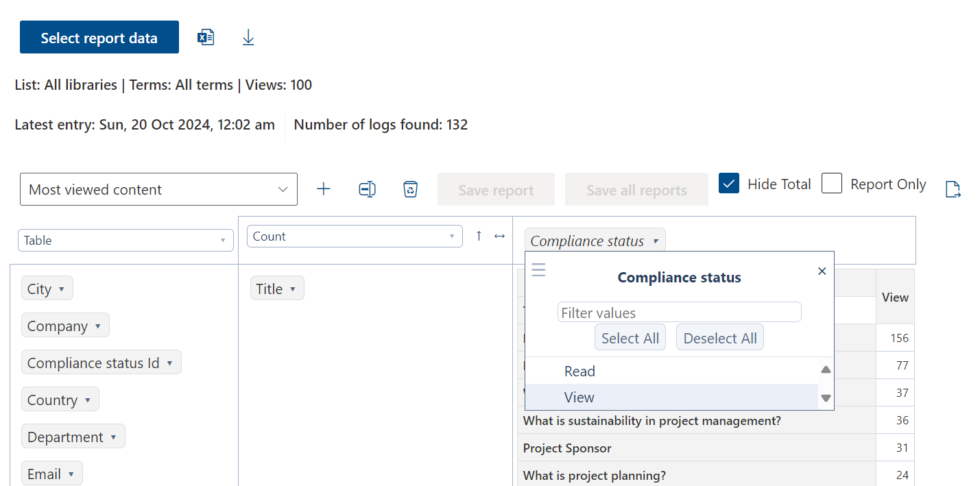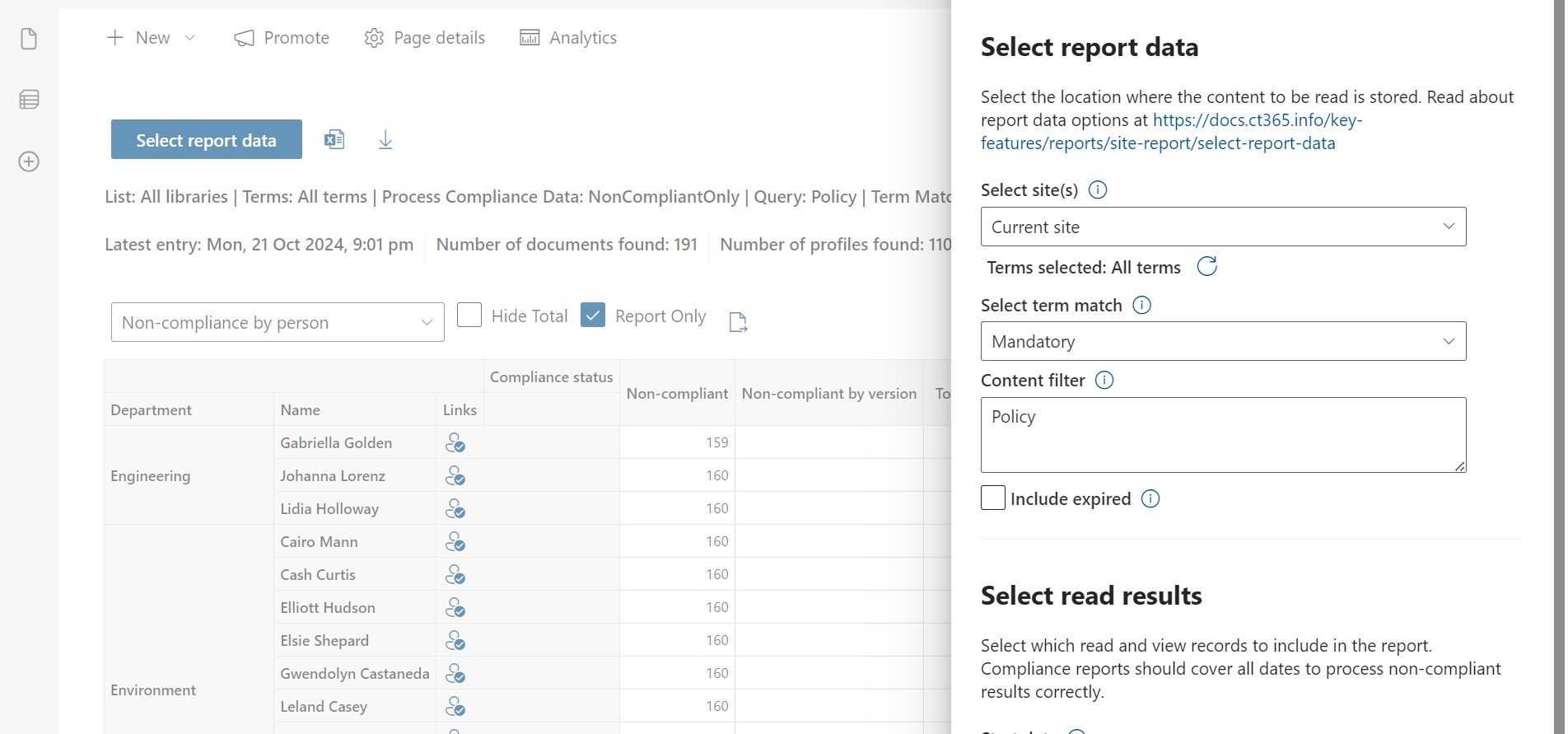 - Compliance status count by content → Shows file, path, and compliance counts (how many people have/haven’t read).